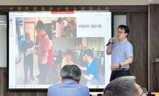 永祥藥局藥師許博程指導用藥整合服務之機構式案例討論,觀察處方及長照機構住民狀況,判定是否有藥物交互作用,比如Metformin要避免跟含Medoxomil藥品共同存放,以防變色。