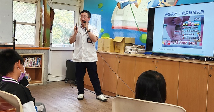 ↑藥師至國小進行「兒童正確用藥暨防制藥物濫用宣講」。