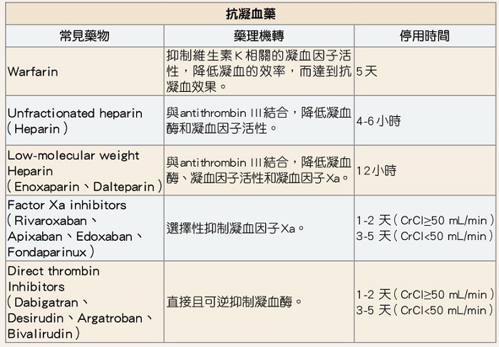 抗血栓藥物指包含抗凝血藥和抗血小板藥。臨床評估於侵入性檢查前是否需停用抗血栓藥,必須衡量檢查術式的出血風險與病患本身的心血管疾病風險,再決定是否停藥或給予銜接性藥物。大腸鏡檢合併切片檢查屬於低出血風險手術,小於2公分的瘜肉切除術屬於高出血風險手術,大於2公分的瘜肉切除術則屬於超高出血風險手術。