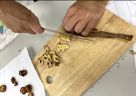 陳乃綸帶來炮製實作,講解藥材切片、土炒與蜜麩炒的技術與差異,強調火候掌控、藥性轉化及品質管控的關鍵細節。從條狀紅皮耆切出0.2公分的馬蹄片,到觀察灶心土的翻炒流動,一刀一鏟,皆連動藥效與飲片規格的相互關係,體現藥師對藥材效用與安全的把關。最後,學員親自調配藥膳與茶包,將理論化為可品嘗的生活保健應用。
