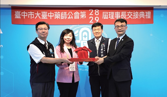 ↑臺中市大臺中藥師公會於5月24日於公會會館舉行更名揭牌及幹部交接典禮。(左圖左二為立委林憶君、右二為台中市衛生局長曾梓展。)