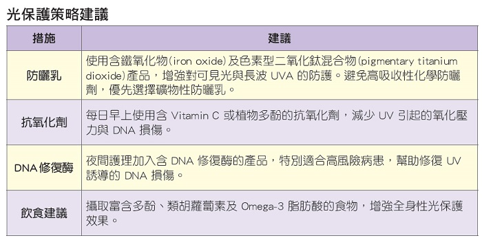 DNA損傷。為有效防護,需採用整合式方法,包括局部抗氧化劑、菸鹼醯胺(niacinamide) 及DNA修復酶。