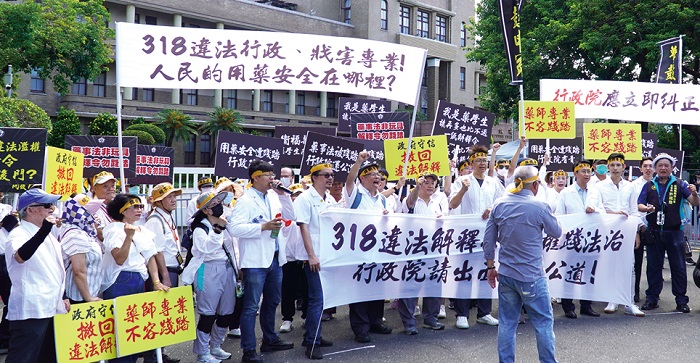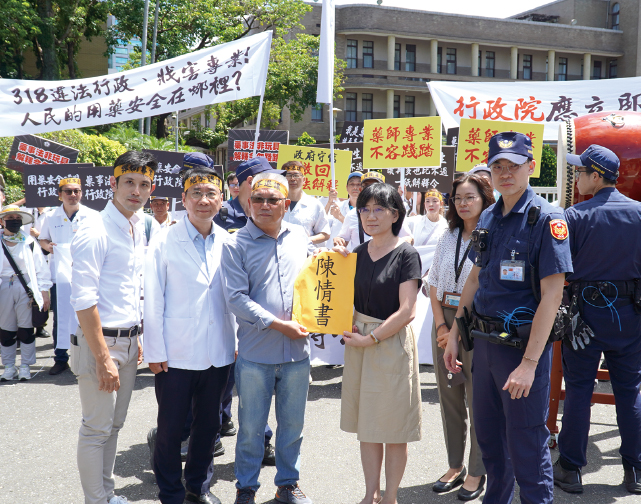 ↑抗議衛福部違法核釋《藥事法》第103條第2項,藥師公會全聯會於7月4日號召藥師及藥學生發起「快閃行政院擊鼓申冤遞陳情書」行動。