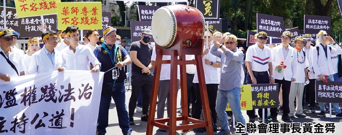 7月4日上午快閃集結行政院前,發起「擊鼓申冤」行動,強烈控訴衛福部違法核釋《藥事法》第103條第2項。藥界重申,《藥事法》歷來規範明確,中藥與西藥皆屬「藥品」,依法應由受過專業訓練的藥師執業與管理,任何繞過法制、破壞制度的做法,絕不容許。