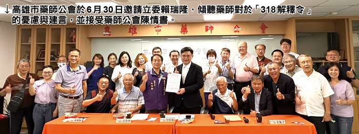 高雄市藥師公會於6月30日召開第十六屆第三次理監事會議,立法委員賴瑞隆親自出席,傾聽基層藥師對於「318解釋令」的憂慮與建言,並接受藥師公會陳情書,承諾將在立法院召開協調會議,積極協助解決爭議,達到多方共贏的局面。