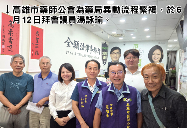 高雄市藥師公會因近來接獲會員反映在申請藥局負責人異動及新設藥局之審查流程繁複等事件,理事長杜仿裕率常務理事羅旭峯、理事徐偉捷、顧問吳明正及兩家藥局負責人於6月12日拜會高雄市議員湯詠瑜反映陳情,期能與市府相關局處單位良性溝通,共同尋求更貼近民眾需求與藥局實務的改善方案。