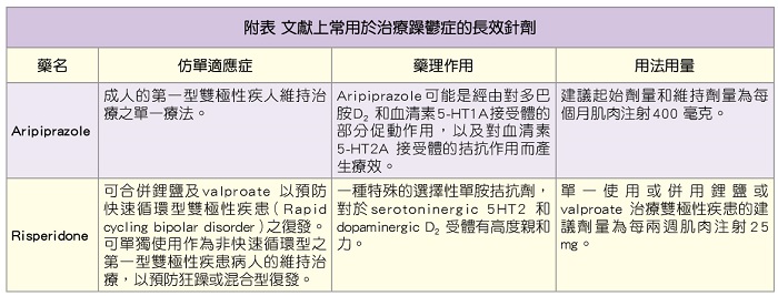 躁鬱症的治療是漫長的過程,如何幫助病人找到可以維持使用藥物的治療方式,對於病人的病情控制有很大的影響。精神科長效針劑的出現,對於服藥順從性不佳的病人能夠穩定維持藥物在體內的血中濃度。相對於病情穩定的病人,若能持續接受長效針劑注射則可預防病情復發。雖然使用長效針劑有注射部位疼痛、缺乏調整劑量的靈活性等缺點,但透過精神科醫師協助,妥善醫病溝通,持續穩定接受治療才能降低疾病復發所產生的相關問題。