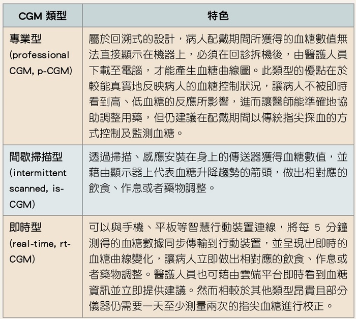 (real-time) 三大類,糖尿病人可以針對自身狀況挑選適合自己的 CGM 類型,各類型的特色說明如下表。