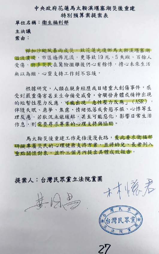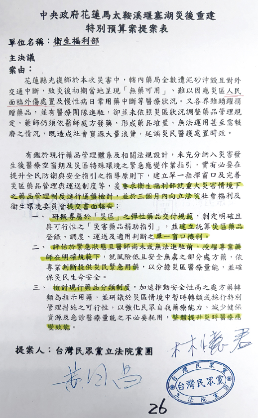 ↑ 立法委員/理事長林憶君要求衛福部檢討重大災害情境下藥品管理制度及研擬災民心理健康支持,順利通過主決議。