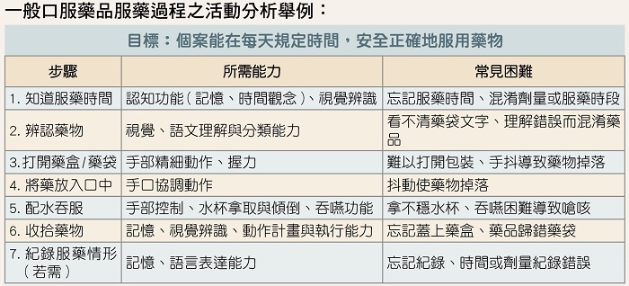 Adherence)係指個案配合醫囑服藥的程度。根據世界衛生組織(WHO)報告指出,全球約有一半的慢性病人無法完全配合用藥,導致疾病控制不佳並增加醫療資源浪費。既然服藥是日常生活活動的一環,便可運用活動分析來拆解服藥行為的步驟與能力需求,進一步找出障礙的原因並進行介入,以有效提升個案的用藥配合度。
