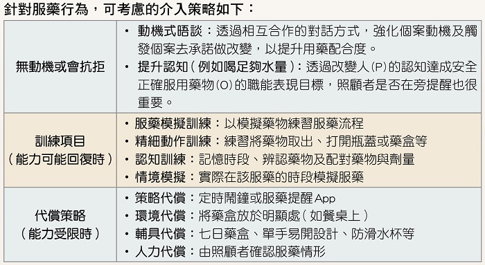 「服藥」不僅僅是將藥物吞下肚那麼簡單,而是一項涵蓋多個步驟、牽涉多方因素的功能性活動。傳統以口頭講授為主的用藥指導方式,往往難以有效提升個案的服藥配合度。本文借助職能治療的觀點,運用PEO理論與活動分析,深入探討「服藥」這項日常生活活動的多重面向,指出影響服藥行為的因素不僅與個體特質、認知有關,亦與環境條件及行為本身密不可分。因此,根據個別差異,結合動機激發、能力訓練與代償策略等多元介入方式,提供具體且可執行的用藥支援,方能使「服藥」不再成為日常生活的障礙,並協助個案盡可能恢復自立與維持健康。