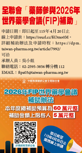 全聯會「藥師參與2026年世界藥學會議(FIP)補助」
