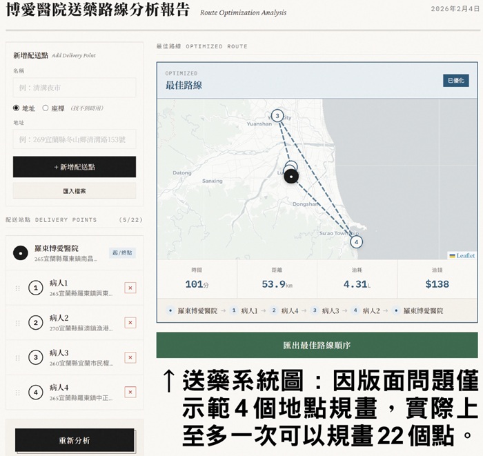 實際測試某天5個送藥點:原本路線65分鐘、43.4公里;系統規畫後變為50分鐘、23.8公里。路程少45%,油錢從111元變61元。
