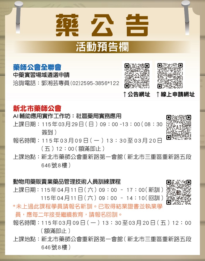 上課地點:新北市藥師公會重新路第一會館(新北市三重區重新路五段646號8樓)