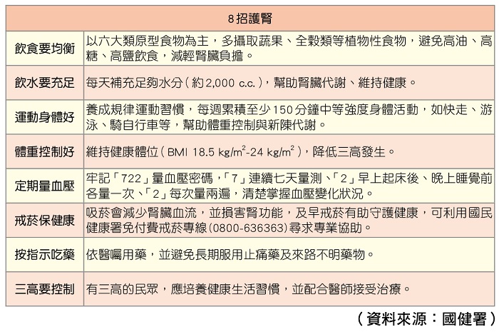 為利於國人能及早進行腎臟病的預防與管理,國健署推動成人預防保健服務,並自114年擴大服務族群,免費提供30~39歲民眾每5年1次、40~64歲民眾每3年1次、65歲以上民眾每年1次的成人預防保健,同時透過「腎病識能衛教指導」,經由醫師說明及提醒,使民眾了解自身腎功能狀況,並強化自我健康管理。