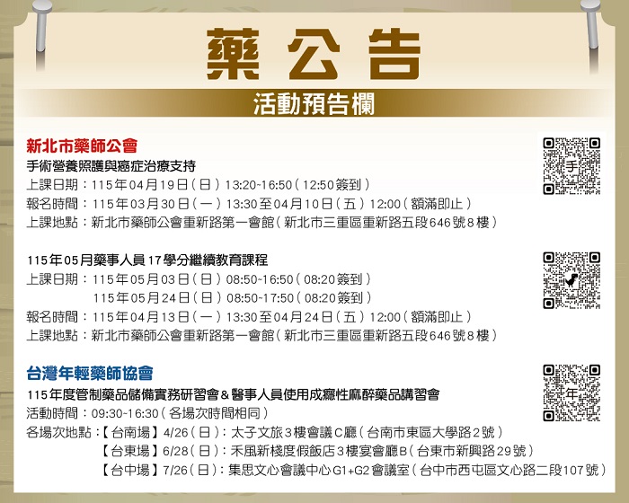 115年度管制藥品儲備實務研習會&醫事人員使用成癮性麻醉藥品講習會