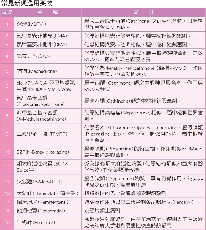 依食品藥物管理署彙整出的「新興濫用藥物四大危害特點」,包括:一、多種成分混合濫用。二、個別劑量差異過大。三、嚴重危害健康。四、包裝外表難以辨認。這些毒品通常會偽裝成咖啡包、奶茶包或糖果等型式,流竄在各種場合或是青少年聚會間,已經嚴重的影響社會安全以及國民健康,目前國內常見新興濫用藥物請參照下表。