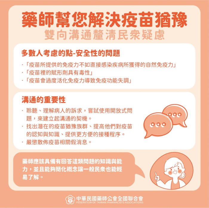 藥師在執業過程中可能會遇到病人透漏或詢問疫苗相關的迷思,例如:「疫苗所提供的免疫力不如直接感染疾病所獲得的自然免疫力」、「疫苗裡的賦形劑具有毒性」、「疫苗會過度活化免疫力導致免疫功能失調」等,藥師應該具備有回答這類問題的知識與能力,並且能夠簡化概念讓一般民眾也能輕易了解。