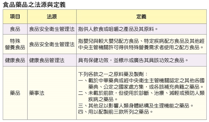 依據「健康食品管理法」,保健食品定義為:經科學化之安全及保健功效評估試驗,證明無害人體健康,且成分具有明確保健功效;其保健功效成分依現有技術無法確定者,得依申請人所列舉具該保健功效之各項原料及佐證文獻,由中央主管機關評估認定之。保健功效定義為:係指增進民眾健康、減少疾病危害風險,且具有實質科學證據之功效,非屬治療、矯正人類疾病之醫療效能。