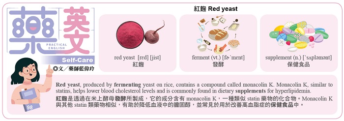紅麴是透過在米上酵母發酵所製成,它的成分含有monacolin K,一種類似statin藥物的化合物。Monacolin